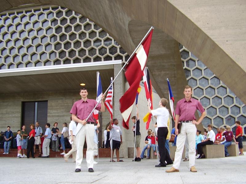 Atgriezušies atpakaļ St.Jonh’n universitātes teritorijā, visa lielā kopkora priekšā mēģinājuma laikā pie sava sarkanbaltsarkanā karoga nodziedājām Latvijas Valsts himnu “Dievs, svētī Latviju”, bet vakarā internacionālajā draudzības klubā iepazīstinājām ar latviešu tautasdziesmām.
